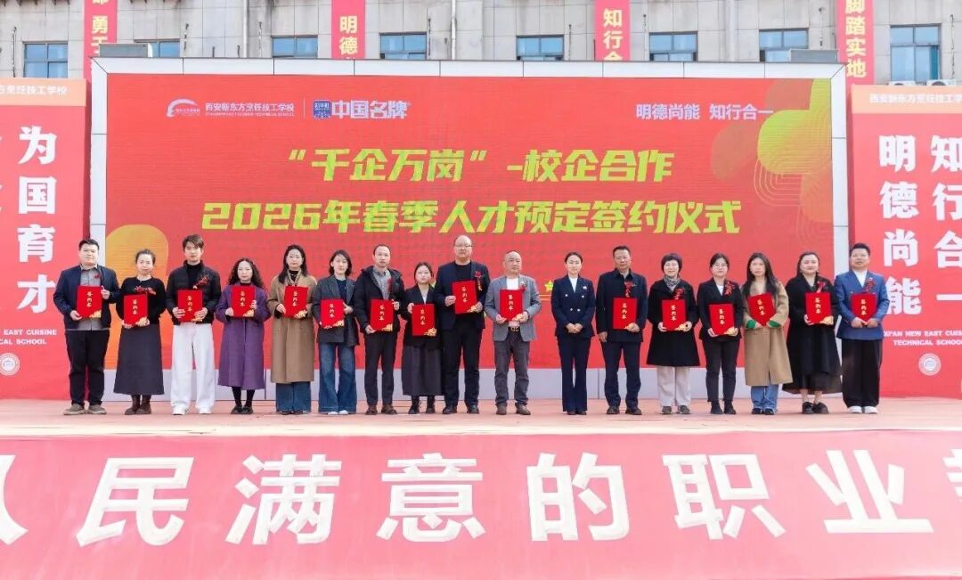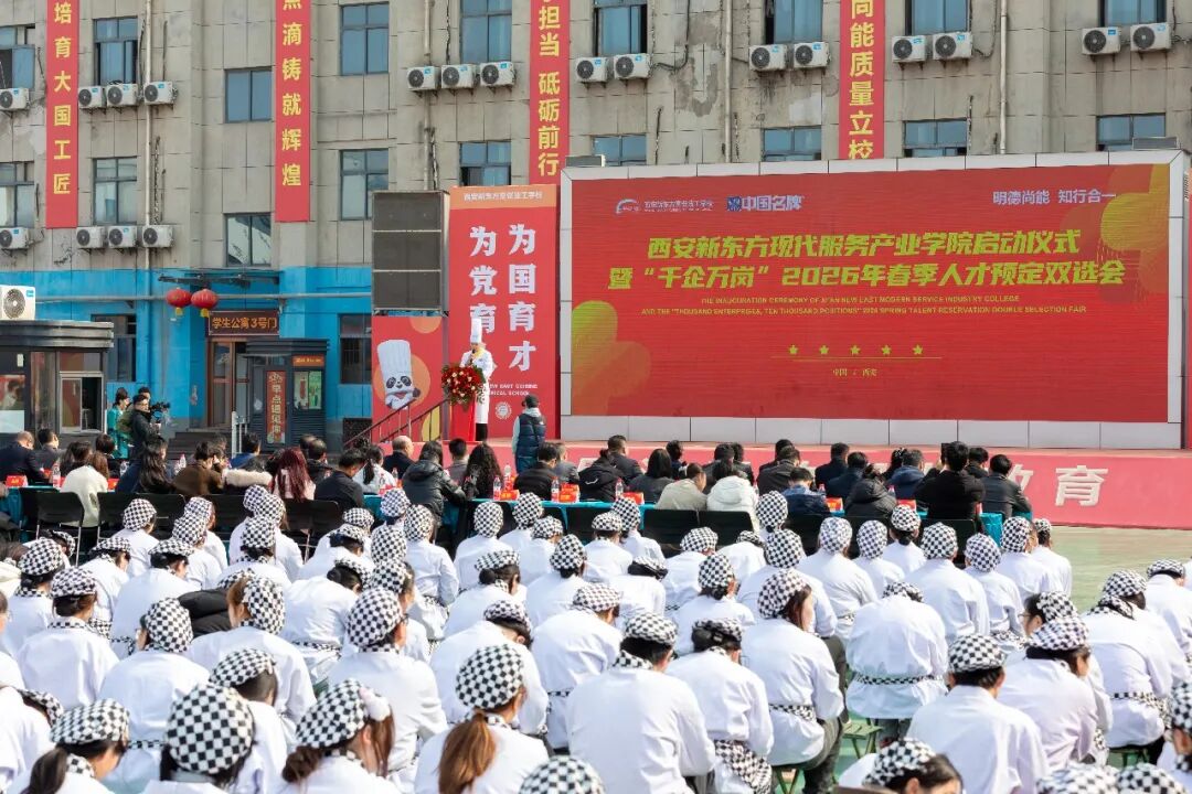 春风送暖,万象更新。2026年3月12日,西安新东方烹饪技工学校现代服务产业学院启动仪式暨“千企万岗”校企合作2026年春季人才预定双选会在学校操场隆重举行。本次活动以“产教融合筑根基 校企协同育人才”为主题,汇聚政府领导、行业协会、近40家餐饮名企及全校1000余名师生,共同见证校企合作新篇章的开启,为2026届毕业生搭建优质就业对接平台。